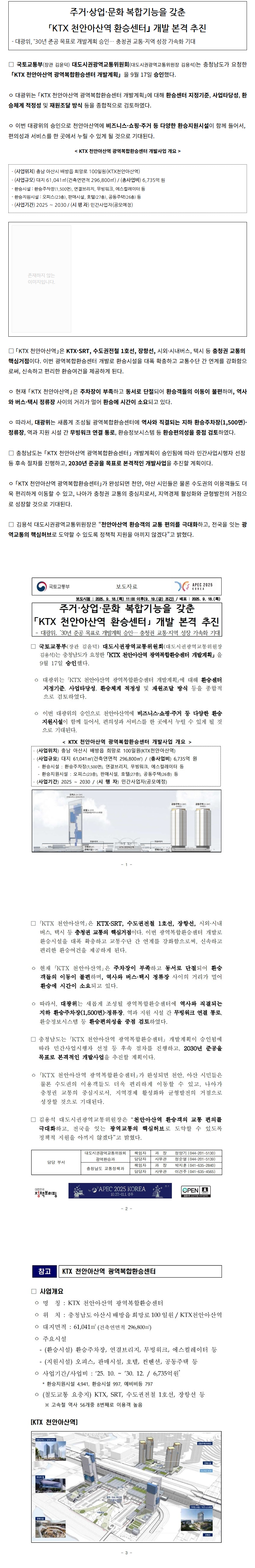 주거·상업·문화 복합기능을 갖춘「KTX 천안아산역 환승센터」 개발 본격 추진- 대광위, ’30년 준공 목표로 개발계획 승인… 충청권 교통·지역 성장 가속화 기대 | 교육팀 / 2025.09.21 | |