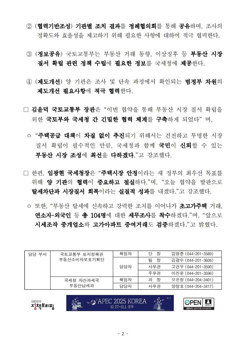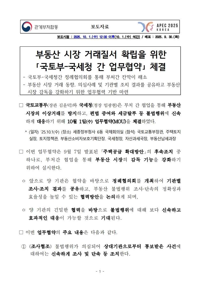 부동산 시장 거래질서 확립을 위한「국토부-국세청 간 업무협약」 체결 | 교육팀 / 2025.10.01 | |