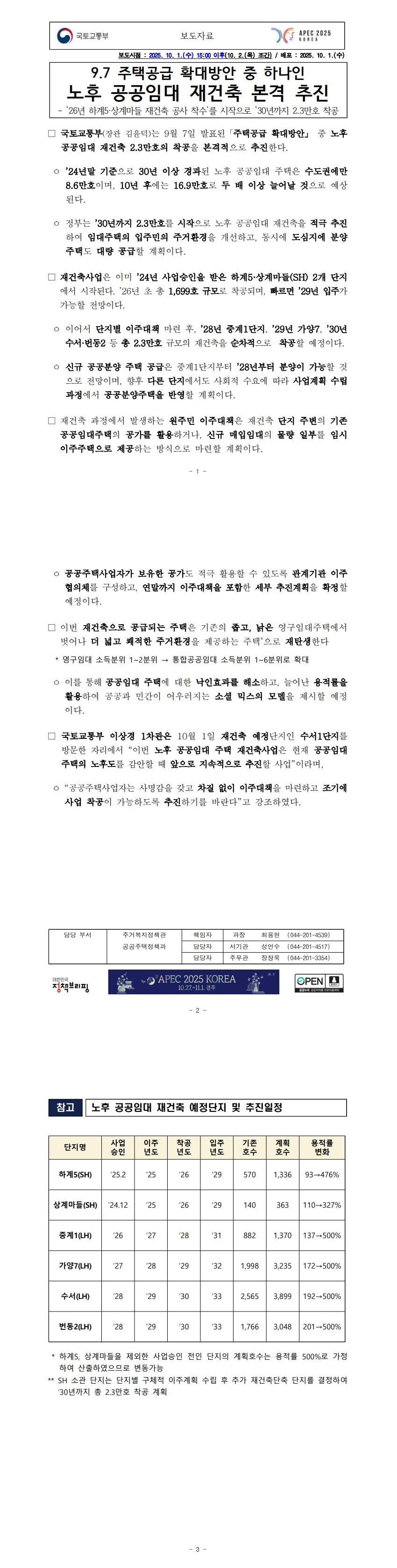 9.7 주택공급 확대방안 중 하나인 노후 공공임대 재건축 본격 추진 - ’26년 하계5·상계마들 재건축 공사 착수’를 시작으로 ’30년까지 2.3만호 착공 □ 국토교통부(장관 김윤덕)는 9월 7일 발표된「주택공급 확대방안」 중 노후 공공임대 재건축 2.3만호의 착공을 본격적으로 추진한다. ㅇ ’24년말 기준으로 30년 이상 경과된 노후 공공임대 주택은 수도권에만 8.6만호이며, 10년 후에는 16.9만호로 두 배 이상 늘어날 것으로 예상된다. ㅇ 정부는 ’30년까지 2.3만호를 시작으로 노후 공공임대 재건축을 적극 추진하여 임대주택의 입주민의 주거환경을 개선하고, 동시에 도심지에 분양주택도 대량 공급할 계획이다. □ 재건축사업은 이미 ’24년 사업승인을 받은 하계5·상계마들(SH) 2개 단지에서 시작된다. ’26년 초 총 1,699호 규모로 착공되며, 빠르면 ’29년 입주가 가능할 전망이다. ㅇ 이어서 단지별 이주대책 마련 후, ’28년 중계1단지, ’29년 가양7, ’30년 수서·번동2 등 총 2.3만호 규모의 재건축을 순차적으로 착공할 예정이다. ㅇ 신규 공공분양 주택 공급은 중계1단지부터 ’28년부터 분양이 가능할 것으로 전망이며, 향후 다른 단지에서도 사회적 수요에 따라 사업계획 수립 과정에서 공공분양주택을 반영할 계획이다. □ 재건축 과정에서 발생하는 원주민 이주대책은 재건축 단지 주변의 기존 공공임대주택의 공가를 활용하거나, 신규 매입임대의 물량 일부를 임시이주주택으로 제공하는 방식으로 마련할 계획이다. ㅇ 공공주택사업자가 보유한 공가도 적극 활용할 수 있도록 관계기관 이주 협의체를 구성하고, 연말까지 이주대책을 포함한 세부 추진계획을 확정할 예정이다. □ 이번 재건축으로 공급되는 주택은 기존의 좁고, 낡은 영구임대주택에서 벗어나 더 넓고 쾌적한 주거환경을 제공하는 주택*으로 재탄생한다 * 영구임대 소득분위 1~2분위 → 통합공공임대 소득분위 1~6분위로 확대 ㅇ 이를 통해 공공임대 주택에 대한 낙인효과를 해소하고, 늘어난 용적률을 활용하여 공공과 민간이 어우러지는 소셜 믹스의 모델을 제시할 예정이다. □ 국토교통부 이상경 1차관은 10월 1일 재건축 예정단지인 수서1단지를 방문한 자리에서 “이번 노후 공공임대 주택 재건축사업은 현재 공공임대 주택의 노후도를 감안할 때 앞으로 지속적으로 추진할 사업”이라며, ㅇ “공공주택사업자는 사명감을 갖고 차질 없이 이주대책을 마련하고 조기에 사업 착공이 가능하도록 추진하기를 바란다”고 강조하였다. ![]() 더 자세한 정보, 자료는 네오비 카페