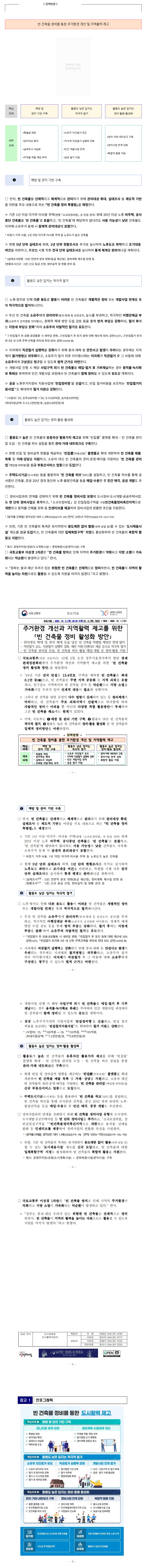 주거환경 개선과 지역활력 제고를 위한 「빈 건축물 정비 활성화 방안」 - 관리대상 확대 및 관리 체계 등을 담은 빈 건축물 특별법 제정안 연내 발의 - 자진철거 유도, 직권철거 실행력 강화, 예산 지원·인센티브 제공 등으로 적극적 철거 - 빈 건축물 관리업 신설, 빈 건축물 허브 활용 매입·개발 등 정비·활용 지원 □ 국토교통부(장관 김윤덕)는 10월 2일 오전 정부서울청사에서 열린 경제관계장관회의에서 주거환경 개선과 지역활력 제고를 위한 「빈 건축물 정비 활성화 방안」을 발표한다. ㅇ ’24년 기준 전국 빈집은 13.4만호, 주택을 제외한 빈 건축물은 최대 6.1만 동(棟)으로, 빈 건축물은 주변 지역 공동화 등 지역 쇠퇴를 유발하고, 인구감소 지역에서의 빈 건축물 증가 등 악순환으로 지방 소멸을 가속화시킬 우려가 있어 선제적 대응이 필요한 상황이다. ㅇ 그러나 빈 건축물 관련 규정이 다수 법령에 산재되어 있는 등 관리체계가 미비하고, 빈 건축물이 주로 쇠퇴지역에 산발적으로 위치함에 따라 자발적인 정비가 어려울 뿐 아니라 다양한 복합 활용방안이 부재하여 그간 빈 건축물 해소에는 한계가 있었다. ㅇ 이에, 국토부는 ➊예방 및 관리 기반 구축, ➋활용도 낮은 빈 건축물의 적극적 철거, ➌활용도 높은 빈 건축물의 정비·활용 활성화 등 빈 건축물의 입체적 정비방안을 마련하였다. ![]() 더 자세한 정보, 자료는 네오비 카페