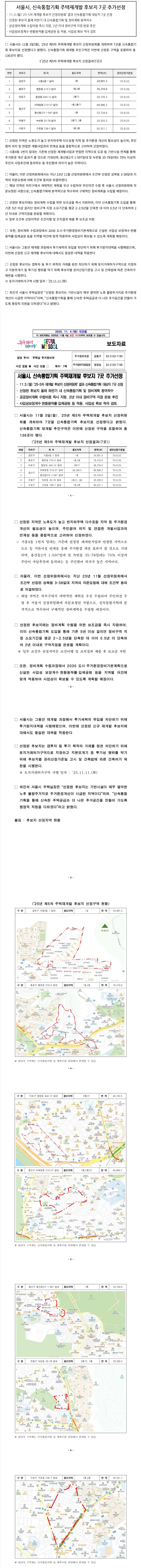 서울시, 신속통합기획 주택재개발 후보지 7곳 추가선정 교육팀 / 2025.11.05