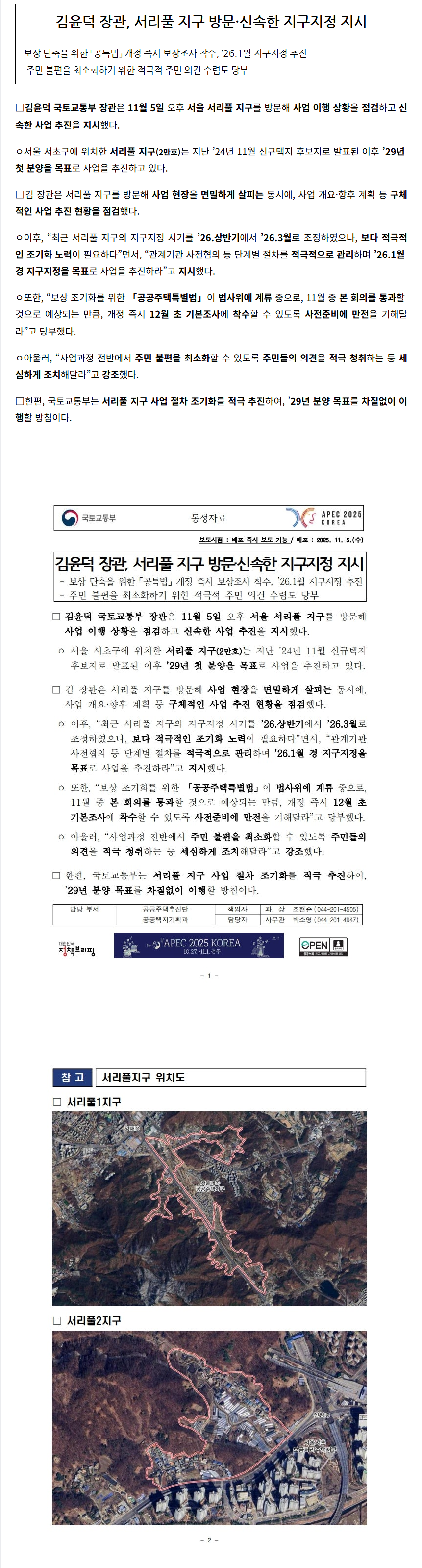 김윤덕 장관, 서리풀 지구 방문·신속한 지구지정 지시 교육팀 / 2025.11.08