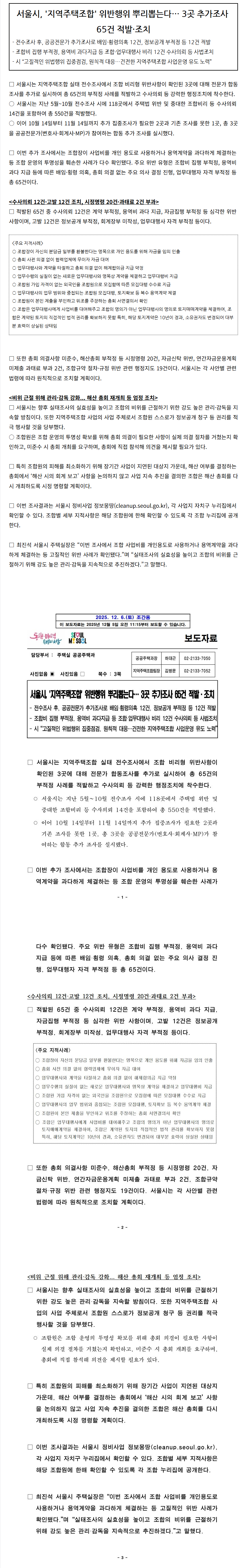 서울시, '지역주택조합' 위반행위 뿌리뽑는다… 3곳 추가조사 65건 적발·조치