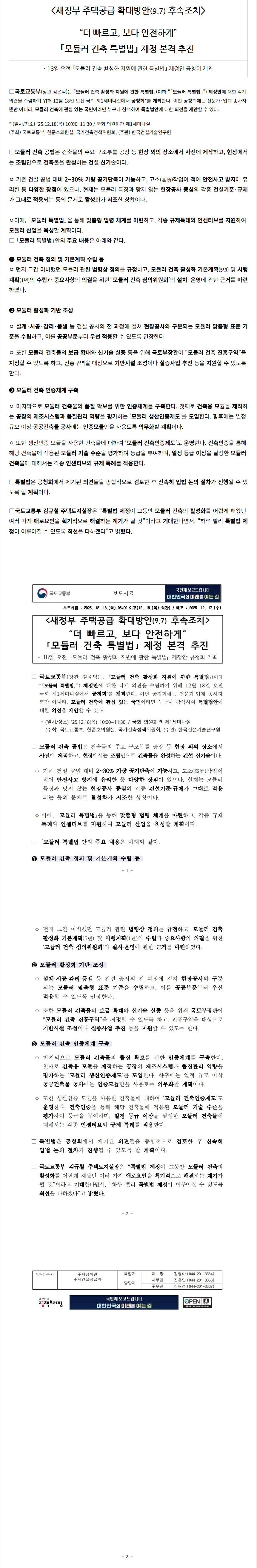 <새정부 주택공급 확대방안(9.7) 후속조치>“더 빠르고, 보다 안전하게”「모듈러 건축 특별법」 제정 본격 추진 교육팀 / 2025.12.19