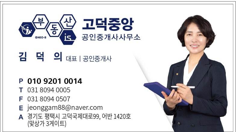 "안녕하세요. 부동산이즈 고덕중앙부동산입니다. 평택고덕국제대로99, 어반그로브 상가 1420호에 오픈하게 되어 인사드립니다. 평택 고덕신도시는 평균연령이 30대로 젊은층 인구가 모인 변화하는 도시이니만큼 흐름을 정확히 읽어내는 중개사가 되겠습니다. 제가 사는 우리동네 신뢰 가는 부동산이 되기 위해 부단히 노력하고 믿음이 가는 중개사가 되기 위해 또한 공부하겠습니다. 든든한 부동산이즈와 함께 고객의 소중한 자산을 연구하고 행복한 미래를 디자인하는 고덕중앙부동산이 되겠습니다. 많은 응원과 관심 부탁드립니다. 감사합니다."