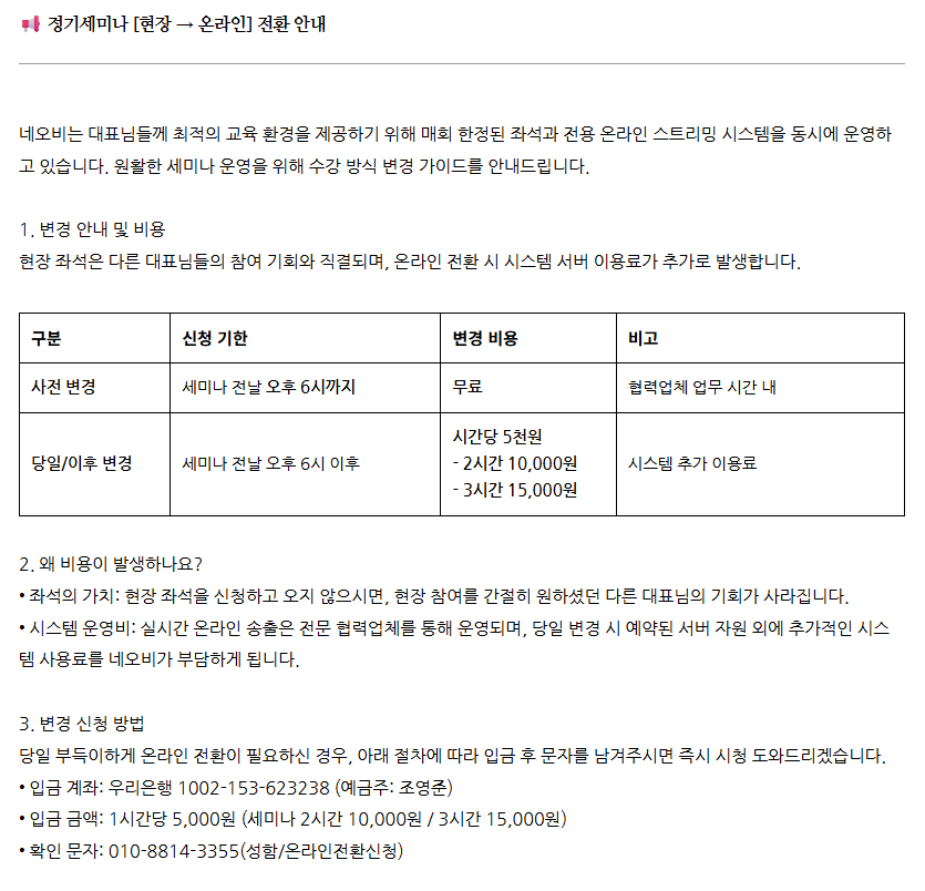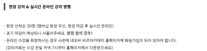 - 온라인 수강을 희망하시는 경우 반드시 네오비 비즈아카데미 홈페이지에 가입이 되어 있어야 합니다.